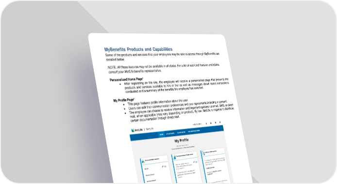 MyBenefits Page 7 of 9 MyBenefits Products and Capabilities Some of the products and services that your employees may be able to access through MyBenefits are detailed below. NOTE: All these features may not be available in all states. For a list of restricted features and states, consult your MetLife benefits representative. Personalized Home Page* • After registering on the site, the employee will receive a personalized page that presents the products and services available to him or her as well as messages about recent transactions conducted and a summary of the benefits the employee has selected. My Profile Page* • This page features profile information about the user. • Users can edit their communication preferences and user agreements including e-consent. • The employee can choose to receive information and important updates via email, SMS, or direct mail, when applicable (may vary depending on product). By law, MetLife is required to distribute certain documentation through direct mail.