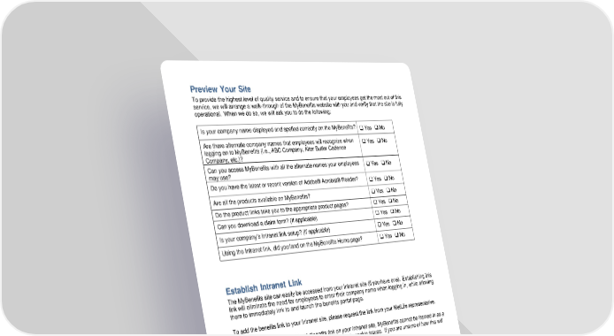 MyBenefits Page 9 of 9 Preview Your Site To provide the highest level of quality service and to ensure that your employees get the most out of this service, we will arrange a walk-through of the MyBenefits website with you and verify that the site is fully operational. When we do so, we will ask you to do the following: Is your company name displayed and spelled correctly on the MyBenefits? ❑ Yes ❑ No Are there alternate company names that employees will recognize when logging on to MyBenefits (i.e., ABC Company, Alter Butler Cadence Company, etc.)? ❑ Yes ❑ No Can you access MyBenefits with all the alternate names your employees may use? ❑ Yes ❑ No Do you have the latest or recent version of Adobe® Acrobat® Reader? ❑ Yes ❑ No Are all the products available on MyBenefits? ❑ Yes ❑ No Do the product links take you to the appropriate product pages? ❑ Yes ❑ No Can you download a claim form? (If applicable) ❑ Yes ❑ No Is your company’s Intranet link setup? (If applicable) ❑ Yes ❑ No Using the Intranet link, did you land on the MyBenefits Home page? ❑ Yes ❑ No Establish Intranet Link The MyBenefits site can easily be accessed from your Intranet site (if you have one). Establishing this link will eliminate the need for employees to enter their company name when logging in, while allowing them to immediately link to and launch the benefits portal page. To add the benefits link to your Intranet site, please request the link from your MetLife representative. Note: If you will be placing the MyBenefits link on your Intranet site, MyBenefits cannot be framed in as a third-party site or treated as a third-party vendor due to cookie issues. If you are unsure of how this will affect your employees, please contact your IT department for assistance. MyBenefits Access via Internet: In addition, your employees can also access MyBenefits via the Internet at the following address: http://www.metlife.com/mybenefits Note: Employee satisfaction is very important to MetLife. To monitor satisfaction, we conduct a daily email survey that is sent to a random sample of users that accessed MyBenefits in the prior 24 hours. We utilize the information from this survey as input for future development and enhancements. Ongoing employee communication Your account representative will be available to answer your MyBenefits inquiries. Note: MetLife has scheduled maintenance windows for MyBenefits. Users will be alerted on the site prior to maintenance or outage.