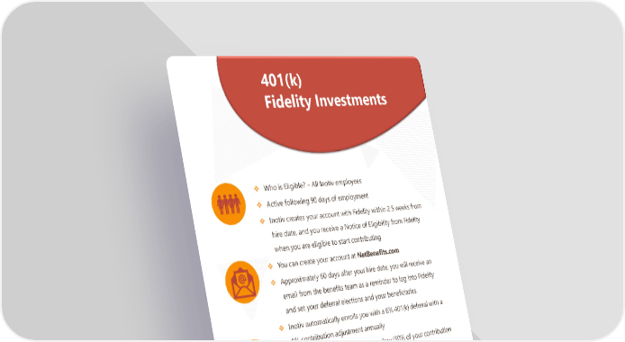 Page 13 | Inotiv | Plan Year 2026 This booklet provides only a summary of your benefits. All services described within are subject to the definitions, limitations, and exclusions set forth in each insurance carrier or providers contract. 401(k) Fidelity Investments Who is Eligible? All Inotiv employees Active following 90 days of employment Inotiv creates your account with Fidelity within 2.5 weeks from hire date, and you receive a Notice of Eligibility from Fidelity when you are eligible to start contributing You can create your account at NetBenefits.com Approximately 60 days after your hire date, you will receive an email from the benefits team as a reminder to log into Fidelity and set your deferral elections and your beneficiaries. Inotiv automatically enrolls you with a 6% 401(k) deferral with a 1% contribution adjustment annually Inotiv matches up to 3% of your salary (50% of your contribution up to a 3% salary match)