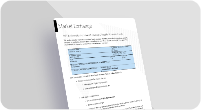 Market Exchange PART B: Information About Health Coverage Offered by Noblesville Schools This section contains information about any health coverage offered by Noblesville Schools. If you decide to complete an application for coverage in the Marketplace, you will be asked to provide this information. This information is numbered to correspond to the Marketplace application. 4. 3. Employername Employer Identification Number Noblesville Schools (EIN) 35-6002702 5. Employer address 6. Employer phone number 18025 River Rd. 317-773-3171 ext. 10203 7.City 8.State 9. ZIP code Noblesville IN 46062 10. Who can we contact about employee health coverage at this job? Jenny Shierant 11. Phone number (if different from above) 12. Email address jenny_shierant@nobl.k12.in.us Here is some basic information about health coverage offered by Noblesville Schools: • As your employer, we offer a health plan to: All employees. Eligible employees are: o Some employees. Eligible employees are: • With respect to dependents: o We do offer coverage. Eligible dependents are: o We do not offer coverage. o If checked, this coverage meets the minimum value standard, and the cost of this coverage to you is intended to be affordable, based on employee wages **Even if your Noblesville Schools intends your coverage to be affordable, you may still be eligible for a premium discount through the Marketplace. The Marketplace will use your household income, along with other factors, to determine whether you may be eligible for a premium discount. If, for example, your wages vary from week to week (perhaps you are an hourly employee or you work on a commission basis), if you are newly employed mid-year, or if you have other income losses, you may still qualify for a premium discount. If you decide to shop for coverage in the Marketplace, HealthCare.gov will guide you through the process. Here's the employer information you'll enter when you visit HealthCare.gov to find out if you can get a tax credit to lower your monthly premiums. Page 31 Noblesville Schools Plan Year 2025 This Compliance Overview is not intended to be exhaustive nor should any discussion or opinions be construed as legal advice. Readers should contact legal counsel for legal advice.