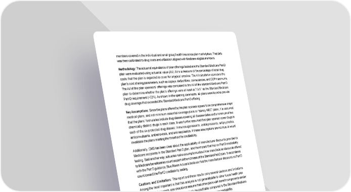 members covered in the individual and small group health insurance plan marketplace. That data was then calibrated to drug costs and utilization aligned with Medicare-eligible members. Methodology : The actuarial equivalence of plan offerings tested and the Standard Medicare Part D plan were evaluated using actuarial value (AV). AV is a measure of the percentage of total drug costs that the plan is expected to cover for a typical enrollee. The AV calculation considers the plan's cost sharing parameters, such as copays, deductibles, coinsurances, and OOP maximums. The AV of the plan sponsors’ offerings was compared to the AV of the standard Medicare Part D plan to determine whether the plan’s offerings were at least as “rich” as the Standard Medicare Part D requirement (>72%). As shown in the opening comments, all plans were found to provide drug coverage that exceeded the Standard Medicare Part D offering. Key Assumptions : Since the plans offered by the plan sponsor appear to be comprehensive major medical plans, and not minimum essential coverage plans or “skinny MEC” plans, it is assumed that the plans’ formularies include drug classes covering all disease states and a minimum of two chemically distinct drugs in each class. It was further assumed that plan sponsor cover drugs in each of the six protected drug classes: immunosuppressants, antidepressants, antipsychotics, anticonvulsants, antiretrovirals, and antineoplastics. If these assumptions are not true, it would invalidate the plans meeting the threshold for creditability. Additionally, CMS has been clear about the applicability of manufacturer discounts provided to Medicare recipients in the Standard Part D plan, and the impact that has on Part D creditability testing. Said another way, actuaries make assumptions about how manufacturer discounts offered to Medicare beneficiaries count as part of the richness of the Standard Part D plan. In accordance with the Part D guidance, Blue Raven Actuarial believes that the manufacturer discounts on Part D count toward the Part D creditability testing. Cautions and Limitations : This report and these results carry several cautions and limitations. Among the most important is that this analysis is not generalizable to other future health plan offerings. In other words, one should not assume that other plans with benefit components similar to the ones that were tested will affirmatively be creditable compared to the Standard Medicare Part D plans. Each plan should be reevaluated each year to determine creditability. There are other factors to bear in mind as well: Claims : The data used for this analysis is and was intended to provide a normative data set for use in calculations such as these. As claims experience emerges in the future, it would be prudent to use that data when refreshing this analysis, both to verify that the plans’ claims are being administered and adjudicated as intended, and to use the best and most relevant possible data to form conclusions about their drug plans’ creditability. Volatility : Volatility and fluctuations in claims data occur for reasons that are out of the control of Blue Raven Actuarial and the plan sponsor. Some of these reasons include, but are not limited to, 2 9 BLUE RAVEN actuarial info@blueravenactuarial.com