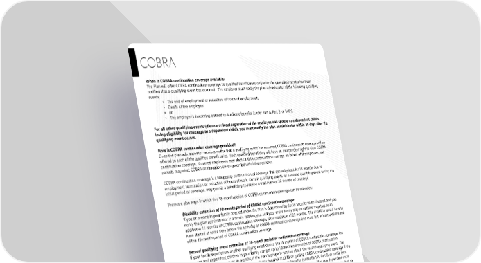 Page 22 Noblesville Schools Plan Year 2026 This Compliance Overview is not intended to be exhaustive nor should any discussion or opinions be construed as legal advice. Readers should contact legal counsel for legal advice. COBRA When is COBRA continuation coverage available? The Plan will offer COBRA continuation coverage to qualified beneficiaries only after the plan administrator has been notified that a qualifying event has occurred. The employer must notify the plan administrator of the following qualifying events: • The end of employment or reduction of hours of employment; • Death of the employee; • or • The employee’s becoming entitled to Medicare benefits (under Part A, Part B, or both). For all other qualifying events (divorce or legal separation of the employee and spouse or a dependent child’s losing eligibility for coverage as a dependent child), you must notify the plan administrator within 60 days after the qualifying event occurs. How is COBRA continuation coverage provided? Once the plan administrator receives notice that a qualifying event has occurred, COBRA continuation coverage will be offered to each of the qualified beneficiaries. Each qualified beneficiary will have an independent right to elect COBRA continuation coverage. Covered employees may elect COBRA continuation coverage on behalf of their spouses, and parents may elect COBRA continuation coverage on behalf of their children. COBRA continuation coverage is a temporary continuation of coverage that generally lasts for 18 months due to employment termination or reduction of hours of work. Certain qualifying events, or a second qualifying event during the initial period of coverage, may permit a beneficiary to receive a maximum of 36 months of coverage. There are also ways in which this 18-month period of COBRA continuation coverage can be extended: Disability extension of 18-month period of COBRA continuation coverage If you or anyone in your family covered under the Plan is determined by Social Security to be disabled and you notify the plan administrator in a timely fashion, you and your entire family may be entitled to get up to an additional 11 months of COBRA continuation coverage, for a maximum of 29 months. The disability would have to have started at some time before the 60th day of COBRA continuation coverage and must last at least until the end of the 18-month period of COBRA continuation coverage. Second qualifying event extension of 18-month period of continuation coverage If your family experiences another qualifying event during the 18 months of COBRA continuation coverage, the spouse and dependent children in your family can get up to 18 additional months of COBRA continuation coverage, for a maximum of 36 months, if the Plan is properly notified about the second qualifying event. This extension may be available to the spouse and any dependent children getting COBRA continuation coverage if the employee or former employee dies; becomes entitled to Medicare benefits (under Part A, Part B, or both); gets divorced or legally separated; or if the dependent child stops being eligible under the Plan as a dependent child. This extension is only available if the second qualifying event would have caused the spouse or dependent child to lose coverage under the Plan had the first qualifying event not occurred. Are there other coverage options besides COBRA Continuation Coverage? Yes. Instead of enrolling in COBRA continuation coverage, there may be other coverage options for you and your family through the Health Insurance Marketplace, Medicare, Medicaid, Children’s Health Insurance Program (CHIP) , or other group health plan coverage options (such as a spouse’s plan) through what is called a “special enrollment period.” Some of these options may cost less than COBRA continuation coverage. You can learn more about many of these options at www.healthcare.gov .