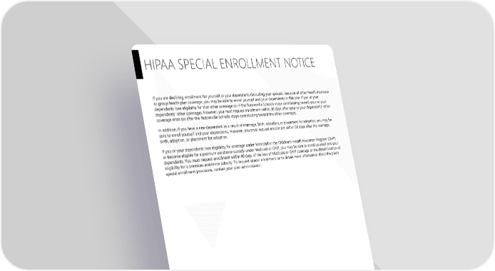 Page 8 Noblesville Schools Plan Year 2026 This Compliance Overview is not intended to be exhaustive nor should any discussion or opinions be construed as legal advice. Readers should contact legal counsel for legal advice. HIPAA SPECIAL ENROLLMENT NOTICE If you are declining enrollment for yourself or your dependents (including your spouse) because of other health insurance or group health plan coverage, you may be able to enroll yourself and your dependents in this plan if you or your dependents lose eligibility for that other coverage (or if the Noblesville Schools stops contributing toward your or your dependents’ other coverage). However, you must request enrollment within 30 days after your or your dependents’ other coverage ends (or after the Noblesville Schools stops contributing toward the other coverage). In addition, if you have a new dependent as a result of marriage, birth, adoption, or placement for adoption, you may be able to enroll yourself and your dependents. However, you must request enrollment within 30 days after the marriage, birth, adoption, or placement for adoption. If you or your dependents lose eligibility for coverage under Medicaid or the Children’s Health Insurance Program (CHIP) or become eligible for a premium assistance subsidy under Medicaid or CHIP, you may be able to enroll yourself and your dependents. You must request enrollment within 60 days of the loss of Medicaid or CHIP coverage or the determination of eligibility for a premium assistance subsidy. To request special enrollment or to obtain more information about the plan's special enrollment provisions, contact your plan administrator.