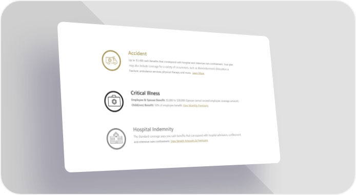 Accident Up to $3,400 cash benefits that correspond with hospital and intensive care confinement. Your plan may also include coverage for a variety of occurrences, such as dismemberment; dislocation or fracture; ambulance services; physical therapy and more. Learn More Critical Illness Employee & Spouse Benefit: $5,000 to $30,000 (Spouse cannot exceed employee coverage amount). Child(ren) Benefit: 50% of employee benefit. View Monthly Premiums Hospital Indemnity The Standard coverage pays you cash benefits that correspond with hospital admission, confinement and intensive care confinement. View Benefit Amounts & Premiums