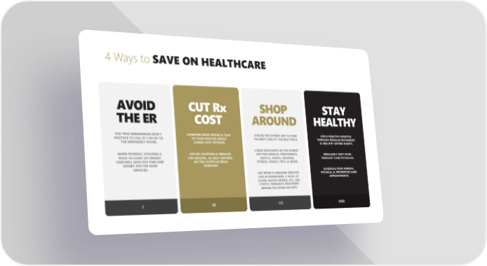 4 Ways to SAVE ON HEALTHCARE AVOID CUT Rx SHOP STAY THE ER COST AROUND HEALTHY FOR TRUE EMERGENCIES DON’T COMPARE DRUG PRICES & TALK UTILIZE THE SYDNEY APP TO FIND LIVE A HEALTHY LIFESTYLE HESITATE TO CALL 911 OR GO TO TO YOUR DOCTOR ABOUT THE BEST CARE AT THE BEST PRICE. THROUGH REGULAR MOVEMENT THE EMERGENCY ROOM. LOWER COST OPTIONS. & HEALTHY EATING HABITS. CHECK DISCOUNTS IN THE SYDNEY WHEN POSSIBLE, UTILIZING A UTILIZE COUPONS & SERVICES APP FOR MEDICAL TREATMENTS, REGULARLY VISIT YOUR WALK-IN CLINIC OR URGENT LIKE GOODRx, Rx HELP CENTERS, DENTAL, VISION, HEARING, PRIMIARY CARE PHYSICIAN. CARE WILL SAVE YOU TIME AND OR THE COSTPLUS DRUG FITNESS, FAMILY, PETS, & MORE. MONEY FOR THE SAME COMPANY. SERVICES. SCHEDULE YOUR ANNUAL LAB WORK & IMAGING SERVICES PHYSICAL & PREVENTIVE CARE LIKE ULTRASOUNDS, X-RAYS, CT APPOINTMENTS. SCANS, BLOOD DRAWS, ETC. ARE COSTLY. RESEARCH PROVIDERS BEFORE YOU MAKE AN APPT. $ $$ $$$ $$$$