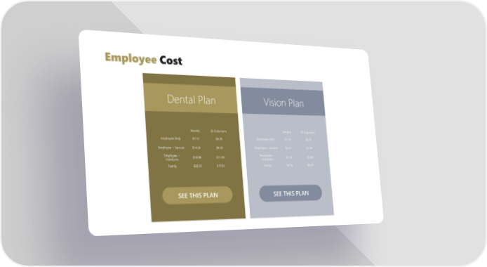 Employee Cost Dental Plan Vision Plan Monthly 20 Deductions Monthly 20 Deductions Employee Only $7.12 $4.28 Employee Only $1.16 $0.70 Employee + Spouse $14.24 $8.55 Employee + Spouse $2.31 $1.39 Employee + $18.98 $11.39 Employee + $2.33 $1.40 Child(ren) Child(ren) Family $28.35 $17.01 Family $3.72 $2.23 SEE THIS PLAN SEE THIS PLAN