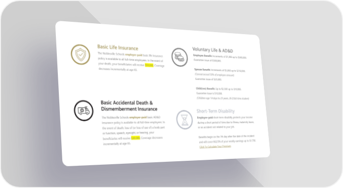 Basic Life Insurance Voluntary Life & AD&D The Noblesville Schools employer-paid basic life insurance Employee Benefit: Increments of $1,000 up to $500,000. policy is available to all full-time employees. In the event of Guarantee issue of $300,000. your death, your beneficiaries will receive $30,000. Coverage Spouse Benefit: Increments of $5,000 up to $250,000. decreases incrementally at age 65. (Cannot exceed 50% of employee amount) Guarantee issue of $25,000. Child(ren) Benefit: Up to $2,500 up to $10,000. Guarantee issue is $10,000. Basic Accidental Death & (Children age 14 days to 23 years, 26 if full-time student) Dismemberment Insurance Short-Term Disability The Noblesville Schools employer-paid basic AD&D Employee-paid short-term disability protects your income insurance policy is available to all full-time employees. In during a short period of time due to illness, maternity leave, the event of death, loss of (or loss of use of) a body part or an accident not related to your job. or function, speech, eyesight, or hearing, your beneficiaries will receive $30,000. Coverage decreases Benefits begin on the 7th day after the date of the incident incrementally at age 65. and will cover 662/3% of your weekly earnings up to $1,750. Click To Calculate Your Premium