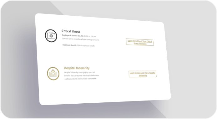 Critical Illness Employee & Spouse Benefit: $5,000 to $30,000 (Spouse cannot exceed employee coverage amount). Child(ren) Benefit: 50% of employee benefit. Hospital Indemnity Hospital Indemnity coverage pays you cash benefits that correspond with hospital admission, confinement and intensive care confinement. Learn More About Voya Critical Illness Insurance Learn More About Voya Hospital Indemnity