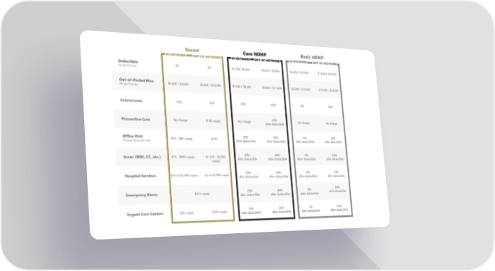 Deductible (Single/Family) $0 $0 $2,200/ $4,400 $4,400 / $8,800 $5,000 / $10,000 $10,000/ $20,000 Out-of-Pocket Max (Single/Family) $4,000 / $8,000 $8,000 / $16,000 $4,400 / $8,800 $8,800 / $17,600 $5,000 / $10,000 $10,000 / $20,000 Coinsurance N/A N/A 20% 40% 0% 30% Preventive Care No charge $100 copay No charge 40% after deductible No charge No charge Office Visit Primary/Specialist Visit $10 - $65 copay $195 20% after deductible 40% after deductible 0% after deductible 30% after deductible Scans (MRI, CT, etc.) $75 - $950 copay $1,350 - $2,850 copay 20% after deductible 40% after deductible 0% after deductible 30% after deductible Hospital Services $15 to $2,500 copay Up to $7,000 copay 20% after deductible 40% after deductible 0% after deductible 30% after deductible Emergency Room $375 copay 20% after deductible 40% after deductible 0% after deductible 30% after deductible Urgent Care Centers $35 copay $105 copay 20% after deductible 40% after deductible 0% after deductible 30% after deductible Surest Core HDHP IN NETWORK OUT-OF-NETWORK IN NETWORK OUT-OF-NETWORK Basic HDHP IN NETWORK OUT-OF-NETWORK