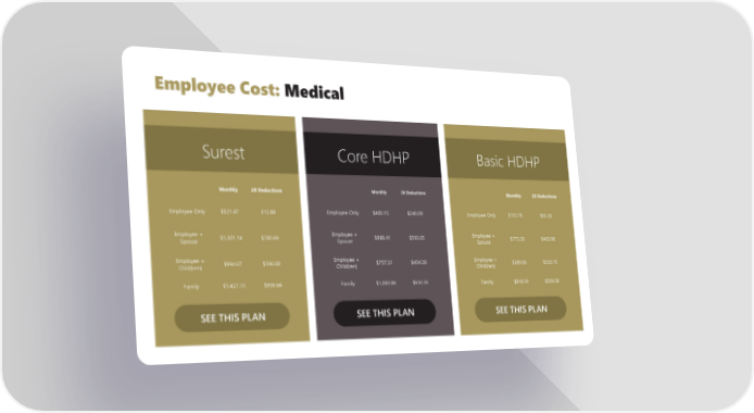 Employee Cost: Medical Core HDHP SEE THIS PLAN Surest SEE THIS PLAN Basic HDHP SEE THIS PLAN Monthly 20 Deductions Employee Only $521.47 312.88 Employee + Spouse $1,301.14 $780.69 Employee + Child(ren) $994.67 $596.80 Family $1,427.73 $856.64 Monthly 20 Deductions Employee Only $400.15 $240.09 Employee + Spouse $988.41 $593.05 Employee + Child(ren) $757.31 $454.39 Family $1,083.88 $650.33 Monthly 20 Deductions Employee Only $153.76 $92.26 Employee + Spouse $773.30 $463.98 Employee + Child(ren) $589.65 $353.79 Family $849.29 $509.58