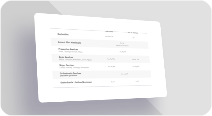 IN NETWORK OUT-OF-NETWORK Deductible No deductible $25 Annual Plan Maximum $1,250 (Maximum Per Person) Preventive Services You Pay 0% Exams, Cleanings, Fluoride, X-Rays Basic Services You Pay 10% You Pay 15% Fillings, Extractions, Endodontics, Crown Repairs Major Services You Pay 40% You Pay 45% Crowns, Dentures, In/Outlays, Periodontics Orthodontia Services You Pay 50% (maximum age limit 18) Orthodontia Lifetime Maximum $1,250 $1,000