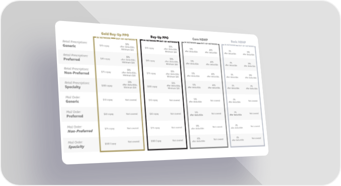 Gold Buy-Up PPO Buy-Up PPO Core HDHP Basic HDHP IN NETWORK OUT-OF-NETWORK IN NETWORK OUT-OF-NETWORK IN NETWORK OUT-OF-NETWORK IN NETWORK OUT-OF-NETWORK Retail Prescriptions: 50% 50% 10% 40% 0% 30% Generic $10 copay after deductible, $10 copay after deductible, after deductible after deductible after deductible after deductible Minimum $30 Minimum $30 Retail Prescriptions: 50% 50% 10% 40% 0% 30% Preferred $30 copay after deductible, $30 copay after deductible, after deductible after deductible after deductible after deductible Minimum $30 Minimum $30 Retail Prescriptions: 50% 50% 10% 40% 0% 30% Non-Preferred $75 copay after deductible, $75 copay after deductible, after deductible after deductible after deductible after deductible Minimum $30 Minimum $30 Retail Prescriptions: 50% 50% 10% 40% 0% 0% $300 copay after deductible, $300 copay after deductible, after deductible after deductible after deductible after deductible Specialty Minimum $30 Minimum $30 Mail Order: $10 copay Not covered $10 copay Not covered 10% Not covered 0% Not covered Generic after deductible after deductible Mail Order: $30 copay Not covered $30 copay Not covered 10% Not covered 0% Not covered Preferred after deductible after deductible Mail Order: $75 copay Not covered $75 copay Not covered 10% Not covered 0% Not covered Non-Preferred after deductible after deductible Mail Order: Not covered $300 Copay Not covered 10% Not covered 0% Not covered Specialty $300 Copay after deductible after deductible