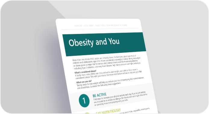 A U G U S T 2 0 2 5 B E S T P R A C T I C E S F O R P R E V E N T I V E C A R E Obesity and You More than one-third of U.S. adults are clinically obese. Furthermore, about one-third of children and adolescents ages 6 to 19 are considered overweight or obese. Being overweight or obese poses a major risk for serious diet-related chronic and life-threatening diseases, including Type 2 diabetes, coronary heart disease, high blood pressure and high cholesterol. What’s considered obese? A body mass index (BMI) over 25 is defined as overweight, and a BMI of 30 or more is considered obese. Talk with your doctor for more information on how to calculate your BMI. What can you do? Taking steps to lose weight will help you reduce your risk of developing diet-related diseases and disabilities. Consider the following three suggestions: BE ACTIVE Find ways to increase your physical activity each day. If you’re just starting out, it could be as simple as taking a 30-minute walk each night after dinner or spending more time playing with your kids. EAT NUTRITIOUSLY Choose sensible portion sizes and eat more fruits, vegetables, whole grains, lean protein and low-fat dairy. SLEEP WELL Get about eight hours of sleep each night. 401 Pennsylvania Pkwy Suite 200 Indianapolis, IN 46280 LHDbenefits.com Office: Population Health: [email protected]