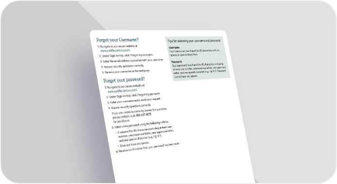 2 Forgot your Username? 1. Navigate to our secure website at www.sunlife.com/account. 2. Under Sign-in help, click I forgot my username. 3. Enter the email address associated with your username. 4. Answer security questions correctly. 5. Receive your username on the next page. Forgot your password? 1. Navigate to our secure website at www.sunlife.com/account. 2. Under Sign-in help, click I forgot my password. 3. Enter your username and submit your request. 4. Answer security questions correctly. If you are unable to correctly answer the questions, please contact us at for assistance. 5. Enter a new password using the following criteria: • Contains 8 to 40 characters including at least one number, one lowercase letter, one uppercase letter, and one special character (e.g. ! @ # ?). • Does not have any spaces. 6. Receive confirmation that your password has been reset. Tips for selecting your username and password Username Your Username must have 8 to 30 characters with no spaces or special characters. Password Your password must have 8 to 40 characters, including at least one number, one lowercase letter, one uppercase letter, and one special character (e.g. ! @ # ?). Password cannot have any spaces. ©2025 Sun Life Assurance Company of Canada, Wellesley Hills, MA 02481. All rights reserved.The Sun Life name and logo are registered trademarks of Sun Life Assurance Company of Canada. WHO-6677Member-i (03/25) 800-247-6875