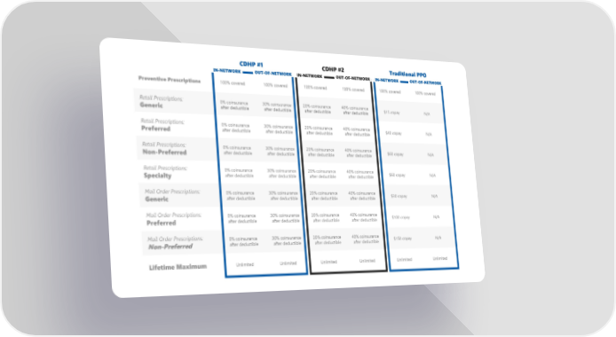 Preventive Prescriptions 100% covered 100% covered 100% covered 100% covered 100% covered 100% covered Retail Prescriptions: Generic 0% coinsurance after deductible 30% coinsurance after deductible 20% coinsurance after deductible 40% coinsurance after deductible $15 copay N/A Retail Prescriptions: Preferred 0% coinsurance after deductible 30% coinsurance after deductible 20% coinsurance after deductible 40% coinsurance after deductible $40 copay N/A Retail Prescriptions: Non-Preferred 0% coinsurance after deductible 30% coinsurance after deductible 20% coinsurance after deductible 40% coinsurance after deductible $60 copay N/A Retail Prescriptions: Specialty 0% coinsurance after deductible 30% coinsurance after deductible 20% coinsurance after deductible 40% coinsurance after deductible $60 copay N/A Mail Order Prescriptions: Generic 0% coinsurance after deductible 30% coinsurance after deductible 20% coinsurance after deductible 40% coinsurance after deductible $30 copay N/A Mail Order Prescriptions: Preferred 0% coinsurance after deductible 30% coinsurance after deductible 20% coinsurance after deductible 40% coinsurance after deductible $100 copay N/A Mail Order Prescriptions: Non-Preferred 0% coinsurance after deductible 30% coinsurance after deductible 20% coinsurance after deductible 40% coinsurance after deductible $150 copay N/A Lifetime Maximum Unlimited Unlimited Unlimited Unlimited Unlimited Unlimited CDHP #1 CDHP #2 Traditional PPO OUT-OF-NETWORK IN-NETWORK OUT-OF-NETWORK IN-NETWORK OUT-OF-NETWORK IN-NETWORK