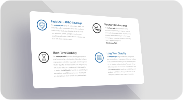 Basic Life + AD&D Coverage The employer-paid group life and accident, death, and dismember policy is available to all full-time employees. In the event of death, loss of (or loss of use of) a body part or function, speech, eyesight, or hearing, your beneficiaries will receive $15,000. Benefits reduce at age 65 to 65% of the original amount. Short-Term Disability The employee-paid short-term disability plan protects your income during a short period of time due to illness or an accident not related to your job. Benefits begin on the 15th day after an illness/accident. The policy will pay 60% of your salary (to a maximum of $1,250/week) for 11 weeks. Partial Disability benefits are available if you are unable to work full time during your disability but are attempting to return to work on a part-time basis. Long-Term Disability The employee-paid long-term disability plan protects your income during a longer period of time due to illness or an accident not related to your job. Benefits begin on the 91st day after an illness/accident. The policy will pay 60% of your salary (to a maximum of $5,000/week) for 5 years. Partial Disability benefits are available if you are unable to work full time during your disability but are attempting to return to work on a part-time basis. Voluntary Life Insurance The employee-paid voluntary life plan can be purchased to supplement your employer-provided coverage. Employees pay 100% of the premiums for Voluntary Benefits. If enrolling for the first time or increasing your amount, an Evidence of Insurability Form is required for approval. View Coverage Table