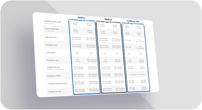 Embedded Deductible (Single/Family) $3,500 / $7,000 $10,500 / $21,000 $7,000 / $14,000 $21,000 / $42,000 $3,000 / $6,000 $6,000 / $12,000 Out-of-Pocket Max (Single/Family) $6,000 / $12,000 $18,000 / $36,000 $7,000 / $14,000 $21,000 / $42,000 $7,000 / $14,000 $14,000 / $28,000 Physician Visits 20% coinsurance after deductible 40% coinsurance after deductible 0% coinsurance after deductible 30% coinsurance after deductible $25 copay 50% after deductible Specialist Visits 20% coinsurance after deductible 40% coinsurance after deductible 0% coinsurance after deductible 30% coinsurance after deductible $40 copay 50% after deductible Coinsurance 20% 40% 0% 30% 30% 50% Preventive Care 100% covered 40% coinsurance after deductible 100% covered 30% after deductible 100% covered 50% after deductible Hospital Services (Maternity, In/Out-Patient) 20% coinsurance after deductible 40% coinsurance after deductible 0% coinsurance after deductible 30% coinsurance after deductible 30% after deductible 50% after deductible Emergency Room 20% coinsurance after deductible 40% coinsurance after deductible 0% coinsurance after deductible 30% coinsurance after deductible $150 copay then 30% of balance Substance Abuse Services 20% coinsurance after deductible 40% coinsurance after deductible 0% coinsurance after deductible 30% coinsurance after deductible 30% after deductible 50% after deductible Therapy Services 20% coinsurance after deductible 40% coinsurance after deductible 0% coinsurance after deductible 30% coinsurance after deductible $40 copay (in office) 50% after deductible CDHP #1 CDHP #2 Traditional PPO OUT-OF-NETWORK IN-NETWORK OUT-OF-NETWORK IN-NETWORK OUT-OF-NETWORK IN-NETWORK