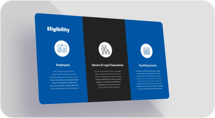 Employees Online Transport is proud to offer a comprehensive benefits package to those employees working 30 or more hours per week. For new hires, medical and dental benefits begin the day following 90 days of employment. Vision, life and disability coverages begin the 1st of the month following 90 days of employment. Spouse & Legal Dependents You may insure yourself, your spouse, and eligible children (until age 26) under the program. If your spouse is employed and your spouse’s employer provides a medical plan for which your spouse is eligible, you will experience an additional $25 surcharge per pay if you elect to cover your spouse under the Online Transport plan. Qualifying Events Employees may add/remove/make benefit changes during the Open Enrollment period which is held annually. However, we understand that life happens. Employees have 31 days from the date of the qualified life event to make changes/updates. Examples of qualified life events are: birth or adoption of a child; marriage or divorce; death; loss of coverage or eligibility for other coverage; and employment status changes. Eligibility