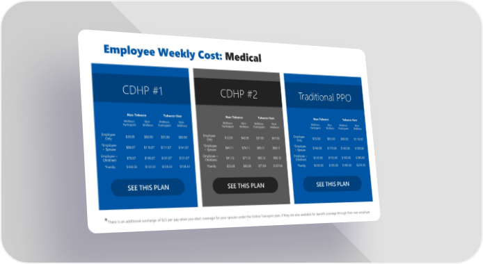 Employee Weekly Cost: Medical CDHP #2 SEE THIS PLAN CDHP #1 SEE THIS PLAN Non-Tobacco Tobacco User Wellness Participant Non- Wellness Wellness Participant Non- Wellness Employee Only $30.00 $60.00 $55.00 $85.00 *Employee + Spouse $86.67 $116.67 $111.67 $141.67 Employee + Child(ren) $76.67 $106.67 $101.67 $131.67 *Family $103.33 $133.33 $128.33 $158.33 Traditional PPO SEE THIS PLAN Non-Tobacco Tobacco User Wellness Participant Non- Wellness Wellness Participant Non- Wellness Employee Only $12.05 $42.05 $37.05 $67.05 *Employee + Spouse $44.11 $74.11 $69.11 $99.11 Employee + Child(ren) $41.12 $71.12 $66.12 $96.12 *Family $52.69 $82.69 $77.69 $107.69 Non-Tobacco Tobacco User Wellness Participant Non- Wellness Wellness Participant Non- Wellness Employee Only $55.00 $85.00 $80.00 $110.00 *Employee + Spouse $140.00 $170.00 $165.00 $195.00 Employee + Child(ren) $125.00 $155.00 $150.00 $180.00 *Family $165.00 $195.00 $190.00 $220.00 *There is an additional surcharge of $25 per pay when you elect coverage for your spouse under the Online Transport plan, if they are also available for benefit coverage through their own employer.