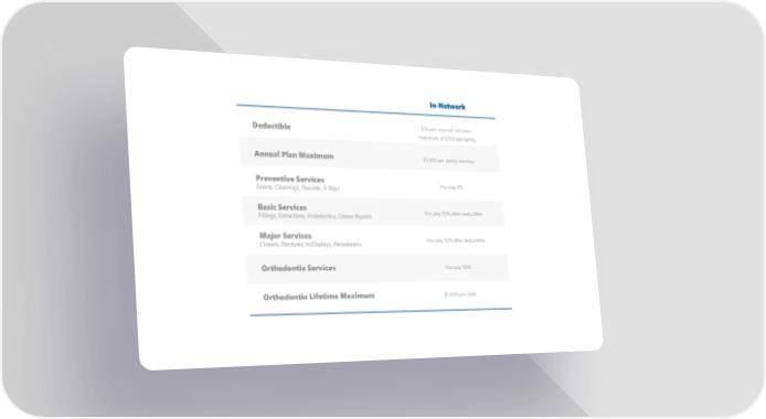 Deductible $50 per covered member, maximum of $150 per family Annual Plan Maximum $1,000 per family member Preventive Services Exams, Cleanings, Fluoride, X-Rays You pay 0% Basic Services Fillings, Extractions, Endodontics, Crown Repairs You pay 20% after deductible Major Services Crowns, Dentures, In/Outlays, Periodontics You pay 50% after deductible Orthodontia Services You pay 50% Orthodontia Lifetime Maximum $1,000 per child In-Network