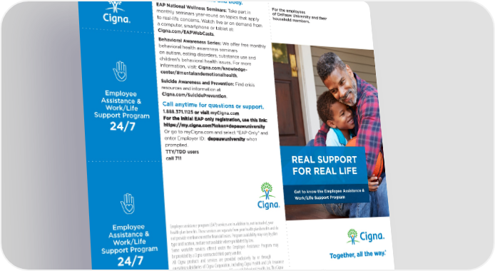 HERE TO HELP. Emotional Health Employee Get 1-3 sessions per issue per year with a dedicated, Assistance & AND SUPPORT. licensed counselor at no cost to you. Work/Life Start by calling or using live chat to get a referral. AND PROBLEM-SOLVE. Through face-to-face or virtual sessions, get support on Support Program a range of topics, such as: With the Employee Assistance & Work/Life › Relationships and parenting 24/7 Support Program, you can get support for › Behavioral health and substance use everyday issues and life challenges. The Employee › Stress management onfidential phone consultations are available to you Assistance & Work/Life Support Program is here C to connect you with real people who can help you and anyone living in your household at no cost. Work CONNECT ANYTIME find real solutions to life’s challenges. with a licensed EAP clinician for 20–30 minutes per phone session. There are no limits to how often you can These services are all confidential and available at call for various concerns; you can expect up to two Call 1.888.371.1125. no additional cost to you and anyone living in your phone sessions per issue. TTY/TDD users call 711. household. Home Life Referrals Get assistance with referrals to community resources Connect through Learn more about EAP at Cigna.com/realsupport. and services. myCigna.com › Adoption: Learn more about your options and the To access mindfulness exercises agencies that can help. Employer ID: and discover stress management › Child Care: We’ll help you find a place, program or depauwuniversity . person that’s right for your family (for initial registration) techniques, explore our › Children with Special Needs: Let us help you better Managing Stress Toolkit at understand and care for your unique family needs. Cigna.com/ManagingStress. › Education Guidance: We’ll help you make the best decisions for your family for college searches and . Coping with disasters more › Senior Care: Learn about solutions related to caring It can be difficult to manage the impact of . for an aging loved one disasters such as flooding, hurricanes, wildfires › Pet Care: From veterinarians to dog walkers, we’ll help or the tragedy of violence affecting your . you ensure your pets are well taken care of community. For online resources to help you and › Convenience Services: Shorten your to-do list with household members cope, visit the Disaster referrals for home maintenance, relocation, dining CONNECT ANYTIME . Resource Center at and more Cigna.com/DisasterResourceCenter. Financial and Legal Assistance › Financial Services Referral: Free 30-minute Call 1.888.371.1125. financial consultations by phone per topic and 25% TTY/TDD users call 711. † off tax preparation software. › Identity Theft: Get a free 60-minute expert Connect through consultation by phone for prevention or if you myCigna.com . are victimized › Legal Consulting: Get a free 30-minute consultation Employer ID: † depauwuniversity with a network attorney and 25% off select fees. (for initial registration) † Customers are required to pay the entire discounted charge for any discounted legal and/or financial services. Legal consultations related to employment matters are excluded. Additional restrictions may apply.