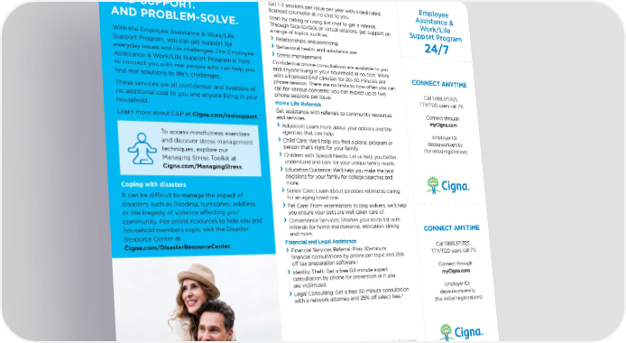 HERE TO HELP. Emotional Health Employee Get 1-3 sessions per issue per year with a dedicated, Assistance & AND SUPPORT. licensed counselor at no cost to you. Work/Life Start by calling or using live chat to get a referral. AND PROBLEM-SOLVE. Through face-to-face or virtual sessions, get support on Support Program a range of topics, such as: With the Employee Assistance & Work/Life › Relationships and parenting 24/7 Support Program, you can get support for › Behavioral health and substance use everyday issues and life challenges. The Employee › Stress management onfidential phone consultations are available to you Assistance & Work/Life Support Program is here C to connect you with real people who can help you and anyone living in your household at no cost. Work CONNECT ANYTIME find real solutions to life’s challenges. with a licensed EAP clinician for 20–30 minutes per phone session. There are no limits to how often you can These services are all confidential and available at call for various concerns; you can expect up to two Call 1.888.371.1125. no additional cost to you and anyone living in your phone sessions per issue. TTY/TDD users call 711. household. Home Life Referrals Get assistance with referrals to community resources Connect through Learn more about EAP at Cigna.com/realsupport. and services. myCigna.com › Adoption: Learn more about your options and the To access mindfulness exercises agencies that can help. Employer ID: and discover stress management › Child Care: We’ll help you find a place, program or depauwuniversity . person that’s right for your family (for initial registration) techniques, explore our › Children with Special Needs: Let us help you better Managing Stress Toolkit at understand and care for your unique family needs. Cigna.com/ManagingStress. › Education Guidance: We’ll help you make the best decisions for your family for college searches and . Coping with disasters more › Senior Care: Learn about solutions related to caring It can be difficult to manage the impact of . for an aging loved one disasters such as flooding, hurricanes, wildfires › Pet Care: From veterinarians to dog walkers, we’ll help or the tragedy of violence affecting your . you ensure your pets are well taken care of community. For online resources to help you and › Convenience Services: Shorten your to-do list with household members cope, visit the Disaster referrals for home maintenance, relocation, dining CONNECT ANYTIME . Resource Center at and more Cigna.com/DisasterResourceCenter. Financial and Legal Assistance › Financial Services Referral: Free 30-minute Call 1.888.371.1125. financial consultations by phone per topic and 25% TTY/TDD users call 711. † off tax preparation software. › Identity Theft: Get a free 60-minute expert Connect through consultation by phone for prevention or if you myCigna.com . are victimized › Legal Consulting: Get a free 30-minute consultation Employer ID: † depauwuniversity with a network attorney and 25% off select fees. (for initial registration) † Customers are required to pay the entire discounted charge for any discounted legal and/or financial services. Legal consultations related to employment matters are excluded. Additional restrictions may apply.