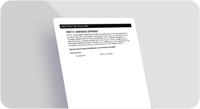 PARTICIPANT FEE DISCLOSURE Page 3 of 11 PART III - INDIVIDUAL EXPENSES The Plan imposes certain charges against individual participants' accounts, rather than against the Plan as a whole, when individual participants incur the charges. These charges may arise based on your use of a feature available under the Plan (e.g., participant distributions), or based on the application of applicable law (e.g., processing a domestic relations order in case of a divorce). In addition, buying or selling some investments may result in charges to your individual account, such as redemption fees. The Comparative Chart provides information about the expenses. The Plan charges the following: Fees that may be charged by Nationwide, your retirement plan provider Withdrawal Fee(s) Overnight Fee $25.00 per transaction