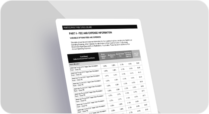 PARTICIPANT FEE DISCLOSURE Page 9 of 11 PART II - FEE AND EXPENSE INFORMATION VARIABLE OPTIONS FEES AND EXPENSES This table shows fee and expense information for the investment options, including the Total Annual Operating Expense, which reduces the rate of return of the investment option. It also shows Shareholder-type Fees and Fund Restrictions, if applicable. These fees are in addition to Total Annual Operating Expenses. Fund Name/ Collective Investment Fund Name Gross Expense Ratio Net Expense Ratio Explicit Asset Fee Total Annual Operating Expenses Cost Per $1,000 Asset Allocation American Funds 2010 Target Date Retirement Fund - Class R6 0.29% 0.29% 0.10% 0.39% $3.90 American Funds 2015 Target Date Retirement Fund - Class R6 0.30% 0.30% 0.10% 0.40% $4.00 American Funds 2020 Target Date Retirement Fund - Class R6 0.31% 0.31% 0.10% 0.41% $4.10 American Funds 2025 Target Date Retirement Fund - Class R6 0.32% 0.32% 0.10% 0.42% $4.20 American Funds 2030 Target Date Retirement Fund - Class R6 0.33% 0.33% 0.10% 0.43% $4.30 American Funds 2035 Target Date Retirement Fund - Class R6 0.35% 0.35% 0.10% 0.45% $4.50 American Funds 2040 Target Date Retirement Fund - Class R6 0.37% 0.37% 0.10% 0.47% $4.70 American Funds 2045 Target Date Retirement Fund - Class R6 0.37% 0.37% 0.10% 0.47% $4.70 American Funds 2050 Target Date Retirement Fund - Class R6 0.38% 0.38% 0.10% 0.48% $4.80 American Funds 2055 Target Date Retirement Fund - Class R6 0.38% 0.38% 0.10% 0.48% $4.80 American Funds 2060 Target Date Retirement Fund - Class R6 0.39% 0.39% 0.10% 0.49% $4.90 American Funds 2065 Target Date Retirement Fund - Class R6 0.39% 0.39% 0.10% 0.49% $4.90 Specialty Cohen & Steers Real Estate Securities Fund, Inc. - Institutional Class 0.84% 0.84% 0.10% 0.94% $9.40 International EuroPacific Growth Fund(R) - Class R6 0.47% 0.47% 0.10% 0.57% $5.70 MFS International Equity Fund - Class R6 0.69% 0.68% 0.10% 0.79% $7.90 New World Fund(SM) - Class R6 0.57% 0.57% 0.10% 0.67% $6.70 Small Cap Fidelity Advisor Small Cap Value Fund - Class Z 0.91% 0.91% 0.10% 1.01% $10.10