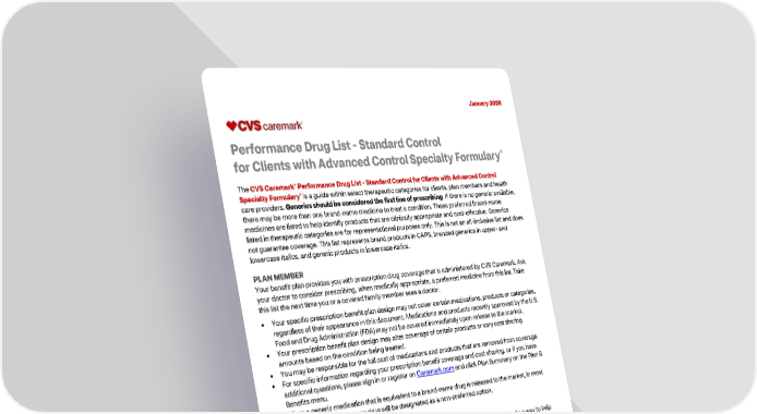 1 January 2026 Performance Drug List - Standard Control for Clients with Advanced Control Specialty Formulary® The CVS Caremark® Performance Drug List - Standard Control for Clients with Advanced Control Specialty Formulary® is a guide within select therapeutic categories for clients, plan members and health care providers. Generics should be considered the first line of prescribing. If there is no generic available, there may be more than one brand-name medicine to treat a condition. These preferred brand-name medicines are listed to help identify products that are clinically appropriate and cost-effective. Generics listed in therapeutic categories are for representational purposes only. This is not an all-inclusive list and does not guarantee coverage. This list represents brand products in CAPS, branded generics in upper- and lowercase Italics, and generic products in lowercase italics. PLAN MEMBER Your benefit plan provides you with prescription drug coverage that is administered by CVS Caremark. Ask your doctor to consider prescribing, when medically appropriate, a preferred medicine from this list. Take this list the next time you or a covered family member sees a doctor. • Your specific prescription benefit plan design may not cover certain medications, products or categories, regardless of their appearance in this document. Medications and products recently approved by the U.S. Food and Drug Administration (FDA) may not be covered immediately upon release to the market. • Your prescription benefit plan design may alter coverage of certain products or vary cost sharing amounts based on the condition being treated. • You may be responsible for the full cost of medications and products that are removed from coverage. • For specific information regarding your prescription benefit coverage and cost sharing, or if you have additional questions, please sign in or register on Caremark.com and click Plan Summary on the Plan & Benefits menu. • When a generic medication that is equivalent to a brand-name drug is released to the market, in most instances, that brand-name drug will be designated as a non-preferred option. HEALTH CARE PROVIDER Your patient is covered under a prescription benefit plan administered by CVS Caremark. As a way to help manage health care costs, authorize generic substitution whenever possible. If you believe a brand-name product is medically necessary, consider prescribing a brand name on this list. • The member's prescription benefit plan design may alter coverage of certain products or vary cost sharing amounts based on the condition being treated. • This drug list represents a summary of prescription coverage. The member’s specific prescription benefit plan design may not cover certain products or categories, regardless of their appearance in this document. Products recently approved by the FDA may not be covered immediately upon release to the market. • The member's prescription benefit plan may have different cost sharing for specific products on the list.