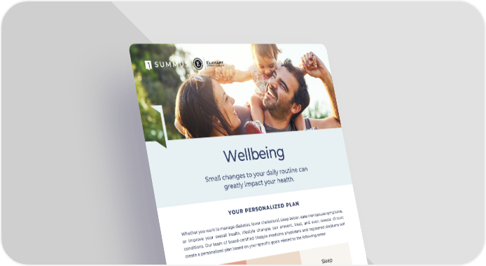 Wellbeing Small changes to your daily routine can greatly impact your health. YOUR PERSONALIZED PLAN Whether you want to manage diabetes, lower cholesterol, sleep better, ease menopause symptoms, or improve your overall health, lifestyle changes can prevent, treat, and even reverse chronic conditions. Our team of board-certi昀椀ed lifestyle medicine physicians and registered dietitians will create a personalized plan based on your speci昀椀c goals related to the following areas: Nutrition and weight Exercise Sleep management Stress Risky behavior Social management reduction connection Scan the QR code, or visit ACTIVATE YOUR www.summusglobal.com/elkhartschools MEMBERSHIP NOW! or contact us to get started: +1-917-565-8540 | [email protected] [DISCLAIMER] Summus offers clinical guidance and referrals, but cannot prescribe medications or provide treatment. If you or someone you know is experiencing suicidal thoughts or having a mental health emergency, call or text the Suicide & Crisis Lifeline at 988 for 24/7, free, and con昀椀dential support, or visit the nearest emergency room.