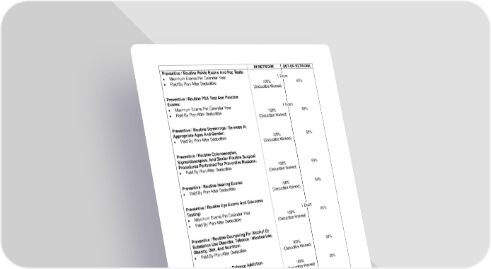 IN-NETWORK OUT-OF-NETWORK Preventive / Routine Pelvic Exams And Pap Tests: • Maximum Exams Per Calendar Year 1 Exam • Paid By Plan After Deductible 100% 60% (Deductible Waived) Preventive / Routine PSA Test And Prostate Exams: • Maximum Exams Per Calendar Year 1 Exam • Paid By Plan After Deductible 100% 60% (Deductible Waived) Preventive / Routine Screenings / Services At Appropriate Ages And Gender: • Paid By Plan After Deductible 100% 60% (Deductible Waived) Preventive / Routine Colonoscopies, Sigmoidoscopies, And Similar Routine Surgical Procedures Performed For Preventive Reasons: • Paid By Plan After Deductible 100% 60% (Deductible Waived) Preventive / Routine Hearing Exams: • Paid By Plan After Deductible 100% 60% (Deductible Waived) Preventive / Routine Eye Exams And Glaucoma Testing: • Maximum Exams Per Calendar Year 1 Exam • Paid By Plan After Deductible 100% 60% (Deductible Waived) Preventive / Routine Counseling For Alcohol Or Substance Use Disorder, Tobacco / Nicotine Use, Obesity, Diet, And Nutrition: • Paid By Plan After Deductible 100% 60% (Deductible Waived) Preventive / Routine Tobacco Addiction: • Paid By Plan After Deductible 100% 60% (Deductible Waived) In Addition, The Following Preventive / Routine Services Are Covered For Women: ➢ Treatment For Gestational Diabetes ➢ Papillomavirus DNA Testing* ➢ Counseling For Sexually Transmitted Infections (Provided Annually)* ➢ Counseling For Human Immune-Deficiency Virus (Provided Annually)* ➢ Breastfeeding Support, Supplies, And Counseling ➢ Counseling For Interpersonal And Domestic Violence For Women (Provided Annually)* • Paid By Plan After Deductible 100% 60% (Deductible Waived) *These Services May Also Apply To Men. -14- 7670-00-413597