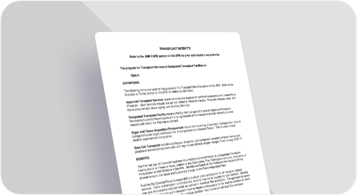 TRANSPLANT BENEFITS Refer to the UMR CARE section of this SPD for prior authorization requirements The program for Transplant Services at Designated Transplant Facilities is: Optum DEFINITIONS The following terms are used for the purpose of the Transplant Benefits section of this SPD. Refer to the Glossary of Terms section of this SPD for additional definitions. Approved Transplant Services means services and supplies for certified transplants when ordered by a Physician. Such services include, but are not limited to, Hospital charges, Physician charges, organ and tissue procurement, tissue typing, and Ancillary Services. Designated Transplant Facility means a facility that has agreed to provide Approved Transplant Services to Covered Persons pursuant to an agreement with a transplant provider network or rental network with which the Plan has a contract. Organ and Tissue Acquisition/Procurement means the harvesting, preparation, transportation, and the storage of human organ and tissue that is transplanted to a Covered Person. This includes related medical expenses of a living donor. Stem Cell Transplant includes autologous, allogeneic, and syngeneic transplant of bone marrow and peripheral and cord blood stem cells and may include chimeric antigen receptor T-cell therapy (CAR-T). BENEFITS The Plan will pay for Covered Expenses Incurred by a Covered Person at a Designated Transplant Facility due to an Illness or Injury, subject to any Deductibles, Plan Participation amounts, maximums, or limits shown on the Schedule of Benefits. Benefits are based on the Protection from Balance Billing allowed amount, the Usual and Customary charge, or the Plan’s Negotiated Rate. It will be the Covered Person's responsibility to obtain prior authorization for all transplant-related services. If prior authorization is not obtained, benefits may not be payable for such services. Benefits may also be subject to reduced levels as outlined in individual Plan provisions. The approved transplant and medical criteria for such transplant must be Medically Necessary for the medical condition for which the transplant is recommended. The medical condition must not be an individual Plan exclusion. COVERED EXPENSES The Plan will pay for Approved Transplant Services at a Designated Transplant Facility for Organ and Tissue Acquisition/Procurement and transplantation, if a Covered Person is the recipient. If a Covered Person requires a transplant, including a bone marrow or Stem Cell Transplant, the cost of Organ and Tissue Acquisition/Procurement from a living human or cadaver will be included as part of the Covered Person’s Covered Expenses when the donor’s own plan does not provide coverage for Organ and Tissue Acquisition/Procurement. Coverage includes the cost of donor testing, blood typing, and evaluation to determine if the donor is a suitable match. The Plan will provide donor services for donor-related complications during the transplant period, per the transplant contract, if the recipient is a Covered Person under this Plan. -72- 7670-00-413597