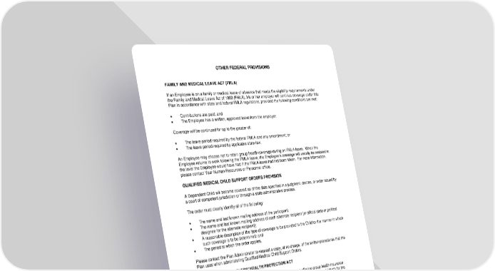 OTHER FEDERAL PROVISIONS FAMILY AND MEDICAL LEAVE ACT (FMLA) If an Employee is on a family or medical leave of absence that meets the eligibility requirements under the Family and Medical Leave Act of 1993 (FMLA), his or her employer will continue coverage under this Plan in accordance with state and federal FMLA regulations, provided the following conditions are met: • Contributions are paid; and • The Employee has a written, approved leave from the employer. Coverage will be continued for up to the greater of: • The leave period required by the federal FMLA and any amendment; or • The leave period required by applicable state law. An Employee may choose not to retain group health coverage during an FMLA leave. When the Employee returns to work following the FMLA leave, the Employee’s coverage will usually be restored to the level the Employee would have had if the FMLA leave had not been taken. For more information, please contact Your Human Resources or Personnel office. QUALIFIED MEDICAL CHILD SUPPORT ORDERS PROVISION A Dependent Child will become covered as of the date specified in a judgment, decree, or order issued by a court of competent jurisdiction or through a state administrative process. The order must clearly identify all of the following: • The name and last known mailing address of the participant; • The name and last known mailing address of each alternate recipient (or official state or political designee for the alternate recipient); • A reasonable description of the type of coverage to be provided to the Child or the manner in which such coverage is to be determined; and • The period to which the order applies. Please contact the Plan Administrator to request a copy, at no charge, of the written procedures that the Plan uses when administering Qualified Medical Child Support Orders. NEWBORNS’ AND MOTHERS’ HEALTH PROTECTION ACT Under federal law, group health plans and health insurance issuers offering group health insurance generally may not restrict benefits for any Hospital length of stay in connection with childbirth for the mother or the newborn Child to less than 48 hours following a vaginal delivery, or less than 96 hours following a Cesarean section. However, the plan or issuer may pay for a shorter stay if the attending Physician (i.e., Your Physician, nurse, or midwife, or a physician assistant) after consultation with the mother, discharges the mother or newborn earlier. Also, under federal law, plans and insurers may not set the level of benefits or out-of-pocket costs so that any later portion of the 48-hour (or 96-hour) stay is treated in a manner less favorable to the mother or newborn than any earlier portion of the stay. In addition, a plan or issuer may not, under federal law, require that a Physician or other health care provider obtain authorization for prescribing a length of stay of up to 48 hours (or 96 hours). However, to use certain providers or facilities, or to reduce Your out-of-pocket costs, You may be required to obtain precertification. For information on precertification, contact Your Plan Administrator. -108- 7670-00-413597