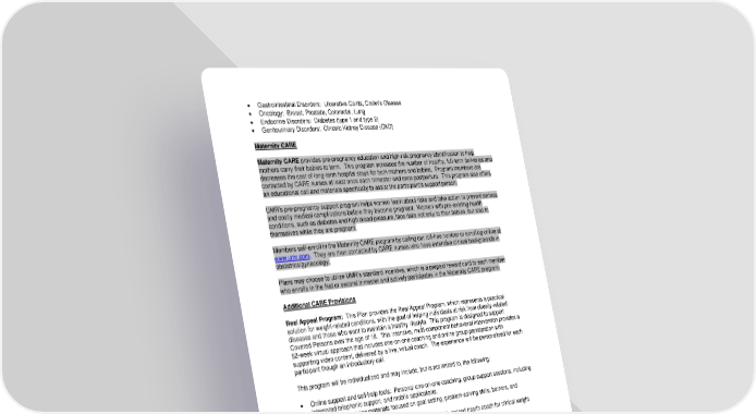 • Gastrointestinal Disorders: Ulcerative Colitis, Crohn’s Disease • Oncology: Breast, Prostate, Colorectal, Lung • Endocrine Disorders: Diabetes (type 1 and type 2) • Genitourinary Disorders: Chronic Kidney Disease (CKD) Maternity CARE Maternity CARE provides pre-pregnancy education and high-risk pregnancy identification to help mothers carry their babies to term. This program increases the number of healthy, full-term deliveries and decreases the cost of long-term hospital stays for both mothers and babies. Program members are contacted by CARE nurses at least once each trimester and once postpartum. This program also offers an educational call and materials specifically to assist the participant’s support person. UMR’s pre-pregnancy support program helps women learn about risks and take action to prevent serious and costly medical complications before they become pregnant. Women with pre-existing health conditions, such as diabetes and high blood pressure, face risks not only to their babies, but also to themselves while they are pregnant. Members self-enroll in the Maternity CARE program by calling our toll-free number or enrolling online at www.umr.com. They are then contacted by CARE nurses who have extensive clinical backgrounds in obstetrics/gynecology. Plans may choose to utilize UMR’s standard incentive, which is a prepaid reward card to each member who enrolls in the first or second trimester and actively participates in the Maternity CARE program. Additional CARE Provisions Real Appeal Program: This Plan provides the Real Appeal Program, which represents a practical solution for weight-related conditions, with the goal of helping individuals at risk from obesity-related diseases and those who want to maintain a healthy lifestyle. This program is designed to support Covered Persons over the age of 18. This intensive, multi-component behavioral intervention provides a 52-week virtual approach that includes one-on-one coaching and online group participation with supporting video content, delivered by a live, virtual coach. The experience will be personalized for each participant though an introductory call. This program will be individualized and may include, but is not limited to, the following: • Online support and self-help tools: Personal one-on-one coaching, group support sessions, including integrated telephonic support, and mobile applications. • Education and training materials focused on goal setting, problem-solving skills, barriers, and strategies to maintain changes. • Behavioral change guidance and counseling by a specially trained health coach for clinical weight loss. Participation is completely voluntary and without any additional charge or cost share. There are no Co-pays, Plan Participation, or Deductibles that need to be met when services are received as part of the Real Appeal Program. If Covered Persons would like to participate, or would like any additional information regarding the program, they can visit the Real Appeal website at Coach.WeRally.com. -82- 7670-00-413597