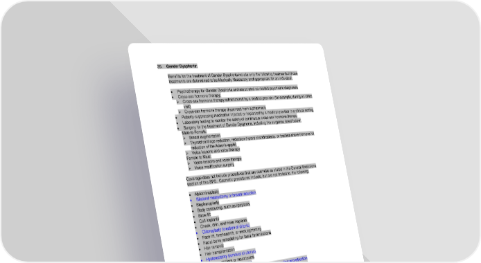 26. Gender Dysphoria: Benefits for the treatment of Gender Dysphoria include only the following treatments if those treatments are determined to be Medically Necessary and appropriate for an individual: • Psychotherapy for Gender Dysphoria and associated co-morbid psychiatric diagnoses • Cross-sex hormone therapy: ➢ Cross-sex hormone therapy administered by a medical provider (for example, during an office visit) ➢ Cross-sex hormone therapy dispensed from a pharmacy • Puberty-suppressing medication injected or implanted by a medical provider in a clinical setting • Laboratory testing to monitor the safety of continuous cross-sex hormone therapy • Surgery for the treatment of Gender Dysphoria, including the surgeries listed below: Male to Female: ➢ Breast augmentation ➢ Thyroid cartilage reduction, reduction thyroid chondroplasty, or trachea shave (removal or reduction of the Adam’s apple) ➢ Voice lessons and voice therapy Female to Male: ➢ Voice lessons and voice therapy ➢ Voice modification surgery Coverage does not include procedures that are cosmetic as stated in the General Exclusions section of this SPD. Cosmetic procedures include, but are not limited to, the following: • Abdominoplasty • Bilateral mastectomy or breast reduction • Blepharoplasty • Body contouring, such as lipoplasty • Brow lift • Calf implants • Cheek, chin, and nose implants • Clitoroplasty (creation of clitoris) • Face lift, forehead lift, or neck tightening • Facial bone remodeling for facial feminizations • Hair removal • Hair transplantation • Hysterectomy (removal of uterus) • Injection of fillers or neurotoxins • Labiaplasty (creation of labia) • Laser or electrolysis hair removal in advance of genital reconstruction • Laser or electrolysis hair removal not related to genital reconstruction • Lip augmentation • Lip reduction • Liposuction • Mastopexy • Metoidioplasty (creation of penis, using clitoris) • Orchiectomy (removal of testicles) • Pectoral implants for chest masculinization • Penectomy (removal of penis) • Penile prosthesis • Phalloplasty (creation of penis) • Rhinoplasty • Salpingo-oophorectomy (removal of fallopian tubes and ovaries) • Scrotoplasty (creation of scrotum) -60- 7670-00-413597