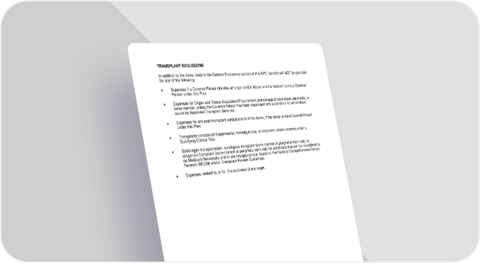 TRANSPLANT EXCLUSIONS In addition to the items listed in the General Exclusions section of this SPD, benefits will NOT be provided for any of the following: • Expenses if a Covered Person donates an organ and/or tissue and the recipient is not a Covered Person under this Plan. • Expenses for Organ and Tissue Acquisition/Procurement and storage of cord blood, stem cells, or bone marrow, unless the Covered Person has been diagnosed with a condition for which there would be Approved Transplant Services. • Expenses for any post-transplant complications of the donor, if the donor is not a Covered Person under this Plan. • Transplants considered Experimental, Investigational, or Unproven unless covered under a Qualifying Clinical Trial. • Solid organ transplantation, autologous transplant (bone marrow or peripheral stem cell), or allogeneic transplant (bone marrow or peripheral stem cell) for conditions that are not considered to be Medically Necessary and/or are not appropriate, based on the National Comprehensive Cancer Network (NCCN) and/or Transplant Review Guidelines. • Expenses related to, or for, the purchase of any organ. -74- 7670-00-413597