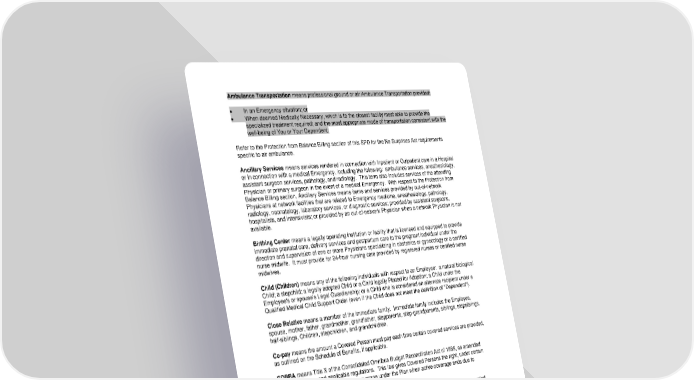 Ambulance Transportation means professional ground or air Ambulance Transportation provided: • In an Emergency situation; or • When deemed Medically Necessary, which is to the closest facility most able to provide the specialized treatment required; and the most appropriate mode of transportation consistent with the well-being of You or Your Dependent. Refer to the Protection from Balance Billing section of this SPD for the No Surprises Act requirements specific to air ambulance. Ancillary Services means services rendered in connection with Inpatient or Outpatient care in a Hospital or in connection with a medical Emergency, including the following: ambulance services, anesthesiology, assistant surgeon services, pathology, and radiology. This term also includes services of the attending Physician or primary surgeon in the event of a medical Emergency. With respect to the Protection from Balance Billing section, Ancillary Services means items and services provided by out-of-network Physicians at network facilities that are related to Emergency medicine, anesthesiology, pathology, radiology, neonatology, laboratory services, or diagnostic services; provided by assistant surgeons, hospitalists, and intensivists; or provided by an out-of-network Physician when a network Physician is not available. Birthing Center means a legally operating institution or facility that is licensed and equipped to provide immediate prenatal care, delivery services and postpartum care to the pregnant individual under the direction and supervision of one or more Physicians specializing in obstetrics or gynecology or a certified nurse midwife. It must provide for 24-hour nursing care provided by registered nurses or certified nurse midwives. Child (Children) means any of the following individuals with respect to an Employee: a natural biological Child; a stepchild; a legally adopted Child or a Child legally Placed for Adoption; a Child under the Employee's or spouse’s Legal Guardianship; or a Child who is considered an alternate recipient under a Qualified Medical Child Support Order (even if the Child does not meet the definition of "Dependent"). Close Relative means a member of the immediate family. Immediate family includes the Employee, spouse, mother, father, grandmother, grandfather, stepparents, step-grandparents, siblings, stepsiblings, half-siblings, Children, stepchildren, and grandchildren. Co-pay means the amount a Covered Person must pay each time certain covered services are provided, as outlined on the Schedule of Benefits, if applicable. COBRA means Title X of the Consolidated Omnibus Budget Reconciliation Act of 1985, as amended from time to time, and applicable regulations. This law gives Covered Persons the right, under certain circumstances, to elect continuation coverage under the Plan when active coverage ends due to qualifying events. Common-Law Marriage means a partnership whereby two adult individuals are considered married because they have lived together for a certain period of time, hold themselves to be married even without a license and a formal ceremony, and meet other applicable requirements of the state in which the Common-Law Marriage was established. Cosmetic Treatment means medical or surgical procedures that are primarily used to improve, alter, or enhance appearance, whether or not for psychological or emotional reasons. Covered Expenses means any expense, or portion thereof, that is Incurred as a result of receiving a covered benefit under this Plan. Details regarding Covered Expenses that are health care services subject to the federal No Surprises Act protections are provided in the Protection from Balance Billing section of this SPD. Covered Person means an Employee, Retiree, or Dependent who is enrolled under this Plan. -118- 7670-00-413597