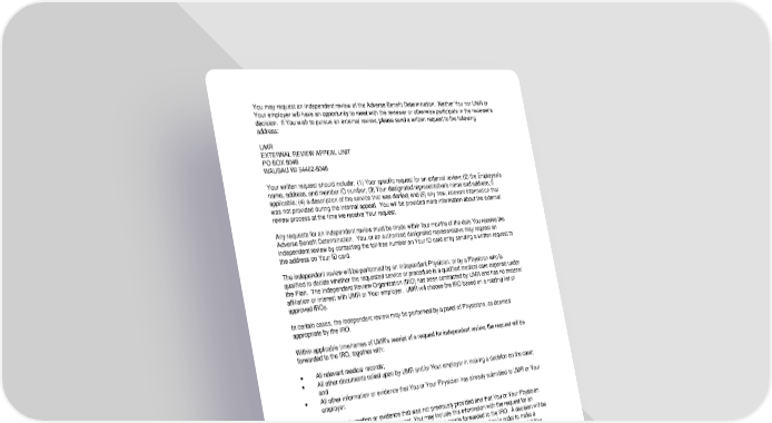 You may request an independent review of the Adverse Benefit Determination. Neither You nor UMR or Your employer will have an opportunity to meet with the reviewer or otherwise participate in the reviewer’s decision. If You wish to pursue an external review, please send a written request to the following address: UMR EXTERNAL REVIEW APPEAL UNIT PO BOX 8048 WAUSAU WI 54402-8048 Your written request should include: (1) Your specific request for an external review; (2) the Employee's name, address, and member ID number; (3) Your designated representative's name and address, if applicable; (4) a description of the service that was denied; and (5) any new, relevant information that was not provided during the internal appeal. You will be provided more information about the external review process at the time we receive Your request. Any requests for an independent review must be made within four months of the date You receive the Adverse Benefit Determination. You, or an authorized designated representative may request an independent review by contacting the toll-free number on Your ID card or by sending a written request to the address on Your ID card. The independent review will be performed by an independent Physician, or by a Physician who is qualified to decide whether the requested service or procedure is a qualified medical care expense under the Plan. The Independent Review Organization (IRO) has been contracted by UMR and has no material affiliation or interest with UMR or Your employer. UMR will choose the IRO based on a rotating list of approved IROs. In certain cases, the independent review may be performed by a panel of Physicians, as deemed appropriate by the IRO. Within applicable timeframes of UMR’s receipt of a request for independent review, the request will be forwarded to the IRO, together with: • All relevant medical records; • All other documents relied upon by UMR and/or Your employer in making a decision on the case; and • All other information or evidence that You or Your Physician has already submitted to UMR or Your employer. If there is any information or evidence that was not previously provided and that You or Your Physician wishes to submit in support of the request, You may include this information with the request for an independent review, and UMR will include it with the documents forwarded to the IRO. A decision will be made within applicable timeframes. If the reviewer needs additional information in order to make a decision, this time period may be extended. The independent review process will be expedited if You meet the criteria for an expedited external review as defined by applicable law. The reviewer’s decision will be in writing and will include the clinical basis for the determination. The IRO will provide You and UMR and/or Your employer with the reviewer’s decision, a description of the qualifications of the reviewer, and any other information deemed appropriate by the organization and/or required by applicable law. If the final independent decision is to approve payment or referral, the Plan will accept the decision and provide benefits for such service or procedure in accordance with the terms and conditions of the Plan. If the final independent review decision is that payment or referral will not be made, the Plan will not be obligated to provide benefits for the service or procedure. You may contact the Claims Administrator at the toll-free number on Your ID card for more information regarding Your external appeal rights and the independent review process. -105- 7670-00-413597