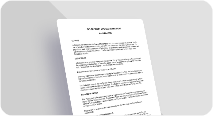OUT-OF-POCKET EXPENSES AND MAXIMUMS Benefit Plan(s) 006 CO-PAYS A Co-pay is the amount that the Covered Person pays each time certain services are received. The Co- pay is typically a flat dollar amount and is paid at the time of service or when billed by the provider. Co- pays do not apply toward satisfaction of Deductibles. Co-pays apply toward satisfaction of in-network and out-of-network out-of-pocket maximums. The Co-pay and out-of-pocket maximum are shown on the Schedule of Benefits. DEDUCTIBLES A Deductible is an amount of money paid once per Plan Year by the Covered Person before any Covered Expenses are paid by this Plan. A Deductible applies to each Covered Person up to a family Deductible limit. When a new Plan Year begins, a new Deductible must be satisfied. Deductible amounts are shown on the Schedule of Benefits. Pharmacy expenses do not count toward meeting the Deductible of this Plan. The Deductible amounts that the Covered Person Incurs for Covered Expenses will be used to satisfy the Deductible(s) shown on the Schedule of Benefits. The Deductible amounts that the Covered Person Incurs at an in-network provider will apply to the in- network total individual and family Deductible. The Deductible amounts that the Covered Person Incurs at an out-of-network provider will apply to the out-of-network total individual and family Deductible. PLAN PARTICIPATION Plan Participation is the percentage of Covered Expenses that the Covered Person is responsible for paying after the Deductible is met. The Covered Person pays this percentage until the Covered Person’s (or family’s, if applicable) annual out-of-pocket maximum is reached. The Plan Participation rate is shown on the Schedule of Benefits. Any payment for an expense that is not covered under this Plan will be the Covered Person’s responsibility. ANNUAL OUT-OF-POCKET MAXIMUMS The annual out-of-pocket maximum is the most the Covered Person pays each year for Covered Expenses. There are separate in-network and out-of-network out-of-pocket maximums for this Plan. Annual out-of-pocket maximums are shown on the Schedule of Benefits. Amounts the Covered Person Incurs for Covered Expenses will be used to satisfy the Covered Person’s (or family’s, if applicable) annual out-of-pocket maximum(s). If the Covered Person’s out-of-pocket expenses in a Plan Year exceed the annual out-of-pocket maximum, the Plan pays 100% of the Covered Expenses through the end of the Plan Year. The following will not be used to meet the out-of-pocket maximums: • Penalties, legal fees and interest charged by a provider. • Expenses for excluded services. • Any charges above the limits specified elsewhere in this document. • Pharmacy out-of-network Co-pays and out-of-network Plan Participation amounts for Prescription benefits. • Any amounts over the Recognized Amount, Usual and Customary amount, Negotiated Rate, or established fee schedule that this Plan pays. -33- 7670-00-413597