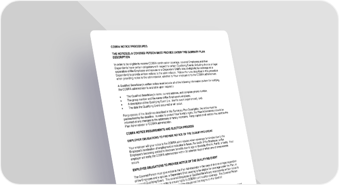 COBRA NOTICE PROCEDURES THE NOTICE(S) A COVERED PERSON MUST PROVIDE UNDER THIS SUMMARY PLAN DESCRIPTION In order to be eligible to receive COBRA continuation coverage, covered Employees and their Dependents have certain obligations with respect to certain Qualifying Events (including divorce or legal separation of the Employee and spouse or a Dependent Child’s loss of eligibility for coverage as a Dependent) to provide written notices to the administrator. Follow the rules described in this procedure when providing notice to the administrator, whether to Your employer or to the COBRA administrator. A Qualified Beneficiary’s written notice must include all of the following information (a form for notifying the COBRA administrator is available upon request.) • The Qualified Beneficiary’s name, current address, and complete phone number, • The group number and the name of the Employee’s employer, • A description of the Qualifying Event (i.e., the life event experienced), and • The date the Qualifying Event occurred or will occur. For purposes of the deadlines described in this Summary Plan Description, the notice must be postmarked by the deadline. In order to protect Your family’s rights, the Plan Administrator should be informed of any changes to the addresses of family members. Keep copies of all notices You send to the Plan Administrator or COBRA administrator. COBRA NOTICE REQUIREMENTS AND ELECTION PROCESS EMPLOYER OBLIGATIONS TO PROVIDE NOTICE OF THE QUALIFYING EVENT Your employer will give notice to the COBRA administrator when coverage terminates due to the Employee’s termination of employment or reduction in hours, the death of the Employee, or the Employee’s becoming entitled to Medicare benefits due to age or disability (Part A, Part B, or both). Your employer will notify the COBRA administrator within 30 calendar days of when one of these events occurs. EMPLOYEE OBLIGATIONS TO PROVIDE NOTICE OF THE QUALIFYING EVENT The Covered Person must give notice to the Plan Administrator in the case of divorce or legal separation of the Employee and a spouse, a Dependent Child ceasing to be eligible for coverage under the Plan, or a second Qualifying Event. The covered Employee or Qualified Beneficiary must provide written notice to the Plan Administrator in order to ensure rights to COBRA continuation coverage. The Covered Person must provide this notice within the 60-calendar-day period that begins on the latest of: • The date of the Qualifying Event; or • The date on which there is a Loss of Coverage (or would be a Loss of Coverage) due to the original Qualifying Event; or • The date on which the Qualified Beneficiary is informed of this notice requirement by receiving this Summary Plan Description or the General COBRA Notice. The Plan Administrator will notify the COBRA administrator within 30 calendar days from the date that notice of the Qualifying Event has been provided. The COBRA administrator will, in turn, provide an election notice to each Qualified Beneficiary within 14 calendar days of receiving notice of a Qualifying Event from the employer, the covered Employee or the Qualified Beneficiary. -45- 7670-00-413597