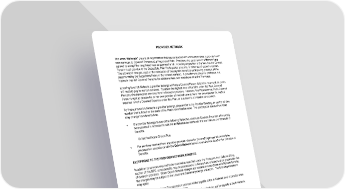 PROVIDER NETWORK The word "Network" means an organization that has contracted with various providers to provide health care services to Covered Persons at a Negotiated Rate. Providers who participate in a Network have agreed to accept the negotiated fees as payment in full, including any portion of the fees that the Covered Person must pay due to the Deductible, Plan Participation amounts, or other out-of-pocket expenses. The allowable charges used in the calculation of the payable benefit to participating providers will be determined by the Negotiated Rates in the network contract. A provider who does not participate in a Network may bill Covered Persons for additional fees over and above what the Plan pays. Knowing to which Network a provider belongs will help a Covered Person determine how much he or she will need to pay for certain services. To obtain the highest level of benefits under this Plan, Covered Persons should receive services from In-Network providers. However, this Plan does not limit a Covered Person's right to choose his or her own provider of medical care at his or her own expense if a medical expense is not a Covered Expense under this Plan, or is subject to a limitation or exclusion. To find out to which Network a provider belongs, please refer to the Provider Directory, or call the toll-free number that is listed on the back of the Plan’s identification card. The participation status of providers may change from time to time. • If a provider belongs to one of the following Networks, claims for Covered Expenses will normally be processed in accordance with the In-Network benefit levels that are listed on the Schedule of Benefits: UnitedHealthcare Choice Plus • For services received from any other provider, claims for Covered Expenses will normally be processed in accordance with the Out-of-Network benefit levels that are listed on the Schedule of Benefits. EXCEPTIONS TO THE PROVIDER NETWORK BENEFITS In addition to services required to be covered as specified under the Protection from Balance Billing section of this SPD, some benefits may be processed at In-Network benefit levels when provided by Out- of-Network providers. When Out-of-Network charges are covered in accordance with Network benefits, the charges may be subject to the Usual and Customary charge limitations. The following exceptions may apply: • Non-air Ambulance Transportation services will be payable at the In-Network level of benefits when provided by an Out-of-Network provider. • Covered services provided by a Physician during an Inpatient stay will be payable at the In-Network level of benefits when provided at an In-Network Hospital. • If there is no In-Network provider, or no In-Network provider is willing or able to provide the necessary service(s) to the Covered Person within a 30-mile radius of the Covered Person’s residence, the Covered Person may be eligible to receive In-Network benefits from an Out-of- Network provider. In this situation, Your In-Network Physician will notify the claims administrator, who will work with You and Your In-Network Physician to coordinate care through an Out-of- Network provider. • Wigs, toupees, and hairpieces will be payable at the In-Network level of benefits when provided by an Out-of-Network provider, -55- 7670-00-413597