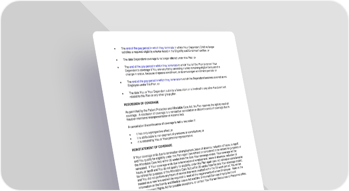 • The end of the pay period in which they terminate in which Your Dependent Child no longer satisfies a required eligibility criterion listed in the Eligibility and Enrollment section; or • The date Dependent coverage is no longer offered under this Plan; or • The end of the pay period in which they terminate in which You tell the Plan to cancel Your Dependent's coverage if You are voluntarily canceling it while remaining eligible because of a change in status, because of special enrollment, or at annual open enrollment periods; or • The end of the pay period in which they terminate in which the Dependent becomes covered as an Employee under this Plan; or • The date You or Your Dependent submits a false claim or is involved in any other fraudulent act related to this Plan or any other group plan. RESCISSION OF COVERAGE As permitted by the Patient Protection and Affordable Care Act, the Plan reserves the right to rescind coverage. A rescission of coverage is a retroactive cancellation or discontinuance of coverage due to fraud or intentional misrepresentation of material fact. A cancellation/discontinuance of coverage is not a rescission if: • it has only a prospective effect; or • it is attributable to non-payment of premiums or contributions; or • it is initiated by You or Your personal representative. REINSTATEMENT OF COVERAGE If Your coverage ends due to termination of employment, leave of absence, reduction of hours, or layoff and You qualify for eligibility under this Plan again (are rehired or considered to be rehired for purposes of the Affordable Care Act) within 26 weeks from the date Your coverage ended, Your coverage will be reinstated. If Your coverage ends due to termination of employment, leave of absence, reduction of hours, or layoff and You do not qualify for eligibility under this Plan again (are not rehired or considered to be rehired for purposes of the Affordable Care Act) within 26 weeks from the date Your coverage ended, and You did not perform any hours of service that were credited within the 26-week period, You will be treated as a new hire and will be required to meet all the requirements of a new Employee. Refer to the information on the Family and Medical Leave Act and the Uniformed Services Employment and Reemployment Rights Act for possible exceptions, or contact Your Human Resources or Personnel office. -42- 7670-00-413597
