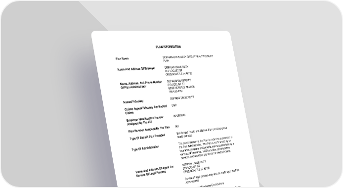 PLAN INFORMATION Plan Name DEPAUW UNIVERSITY GROUP HEALTH BENEFIT PLAN Name And Address Of Employer DEPAUW UNIVERSITY 313 LOCUST ST GREENCASTLE IN 46135 Name, Address, And Phone Number DEPAUW UNIVERSITY Of Plan Administrator 313 LOCUST ST GREENCASTLE IN 46135 765-658-4181 Named Fiduciary DEPAUW UNIVERSITY Claims Appeal Fiduciary For Medical UMR Claims Employer Identification Number 35-0869045 Assigned By The IRS Plan Number Assigned By The Plan 501 Type Of Benefit Plan Provided Self-funded Health and Welfare Plan providing group health benefits. Type Of Administration The administration of the Plan is under the supervision of the Plan Administrator. The Plan is not financed by an insurance company and benefits are not guaranteed by a contract of insurance. UMR provides administrative services such as claim payments for medical claims. Name And Address Of Agent For DEPAUW UNIVERSITY Service Of Legal Process 313 LOCUST ST GREENCASTLE IN 46135 Service of legal process may also be made upon the Plan Administrator. Funding Of The Plan Employer and Employee Contributions Benefits are provided by a benefit Plan maintained on a self-insured basis by Your employer. Benefit Plan Year Benefits begin on January 1 and end on the following December 31. For new Employees and Dependents, a Benefit Plan Year begins on the individual's Effective Date and runs through December 31 of the same Benefit Plan Year. ERISA Plan Year July 1 through June 30 -2- 7670-00-413597
