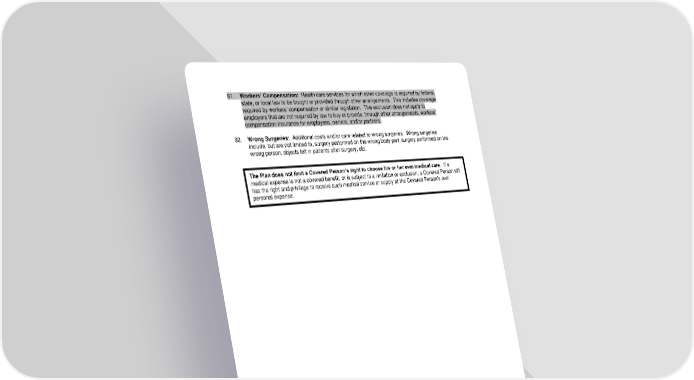 91. Workers’ Compensation: Health care services for which other coverage is required by federal, state, or local law to be bought or provided through other arrangements. This includes coverage required by workers’ compensation or similar legislation. This exclusion does not apply to employers that are not required by law to buy or provide, through other arrangements, workers’ compensation insurance for employees, owners, and/or partners. 92. Wrong Surgeries: Additional costs and/or care related to wrong surgeries. Wrong surgeries include, but are not limited to, surgery performed on the wrong body part, surgery performed on the wrong person, objects left in patients after surgery, etc. The Plan does not limit a Covered Person’s right to choose his or her own medical care. If a medical expense is not a covered benefit, or is subject to a limitation or exclusion, a Covered Person still has the right and privilege to receive such medical service or supply at the Covered Person’s own personal expense. -96- 7670-00-413597