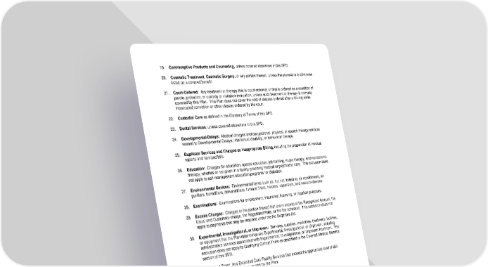 19. Contraceptive Products and Counseling, unless covered elsewhere in this SPD. 20. Cosmetic Treatment, Cosmetic Surgery, or any portion thereof, unless the procedure is otherwise listed as a covered benefit. 21. Court-Ordered: Any treatment or therapy that is court-ordered, or that is ordered as a condition of parole, probation, or custody or visitation evaluation, unless such treatment or therapy is normally covered by this Plan. This Plan does not cover the cost of classes ordered after a driving-while- intoxicated conviction or other classes ordered by the court. 22. Custodial Care as defined in the Glossary of Terms of this SPD. 23. Dental Services, unless covered elsewhere in this SPD. 24. Developmental Delays: Medical charges and occupational, physical, or speech therapy services related to Developmental Delays, intellectual disability, or behavioral therapy. 25. Duplicate Services and Charges or Inappropriate Billing, including the preparation of medical reports and itemized bills. 26. Education: Charges for education, special education, job training, music therapy, and recreational therapy, whether or not given in a facility providing medical or psychiatric care. This exclusion does not apply to self-management education programs for diabetics. 27. Environmental Devices: Environmental items such as, but not limited to, air conditioners, air purifiers, humidifiers, dehumidifiers, furnace filters, heaters, vaporizers, and vacuum devices. 28. Examinations: Examinations for employment, insurance, licensing, or litigation purposes. 29. Excess Charges: Charges or the portion thereof that are in excess of the Recognized Amount, the Usual and Customary charge, the Negotiated Rate, or the fee schedule. This exclusion does not apply to payments that may be required under the No Surprises Act. 30. Experimental, Investigational, or Unproven: Services, supplies, medicines, treatment, facilities, or equipment that the Plan determines are Experimental, Investigational, or Unproven, including administrative services associated with Experimental, Investigational, or Unproven treatment. This exclusion does not apply to Qualifying Clinical Trials as described in the Covered Medical Benefits section of this SPD. 31. Extended Care: Any Extended Care Facility Services that exceed the appropriate level of skill required for treatment as determined by the Plan. 32. Family Planning: Consultations for family planning. 33. Financial Counseling. 34. Fitness Programs: General fitness programs, exercise programs, exercise equipment, and health club memberships, or other utilization of services, supplies, equipment, or facilities in connection with weight control or bodybuilding. 35. Foot Care (Podiatry): Routine foot care. 36. Genetic Counseling, unless covered elsewhere in this SPD. 37. Genetic Testing, unless covered elsewhere in this SPD. 38. Growth Hormones. 39. Hearing Services: Purchase or fitting of hearing aids unless covered elsewhere in this SPD. -92- 7670-00-413597