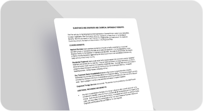 SUBSTANCE USE DISORDER AND CHEMICAL DEPENDENCY BENEFITS The Plan will pay for the following Covered Expenses for a Covered Person, subject to any Deductibles, Co-pays if applicable, Plan Participation amounts, maximums, or limits shown on the Schedule of Benefits. Benefits are based on the Protection from Balance Billing allowed amount, the Usual and Customary amount, the maximum fee schedule, or the Negotiated Rate. COVERED BENEFITS Inpatient Services means services provided at a Hospital or facility accredited by a recognized accrediting body or licensed by the state as an acute care psychiatric, chemical dependency, or dual- diagnosis facility for the treatment of substance use disorders. If outside the United States, the Hospital or facility must be licensed or approved by the foreign government or an accreditation of the licensing body working in that foreign country. Residential Treatment means a sub-acute facility-based program that is licensed to provide “residential” treatment and delivers 24-hour-per-day, 7-day-per-week assessment and diagnostic services, as well as active behavioral health treatment for substance related disorders. Coverage does not include facilities or programs where therapeutic services are not the primary service being provided (e.g., therapeutic boarding schools, halfway houses, and group homes.) Day Treatment (Partial Hospitalization) means a day treatment program that offers intensive, multidisciplinary services not otherwise offered in an Outpatient setting. The treatment program generally consists of a minimum of 20 hours of scheduled programming extended over a minimum of five days per week. Such a program must be a less restrictive alternative to Inpatient treatment. Outpatient Therapy Services are covered. The services must be provided by a Qualified Provider. ADDITIONAL PROVISIONS AND BENEFITS • Any claim re-submitted on the basis of a change in diagnosis after a benefit denial will not be considered for benefits unless the Plan is provided with all records along with the request for the change. Such records must include the history, initial assessment and all counseling or therapy notes, and must reflect the criteria listed in the most recent American Psychiatric Association Diagnostic and Statistical Manual (DSM) for the new diagnosis. -78- 7670-00-413597