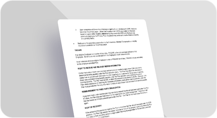 ➢ Upon completion of 30 months of Medicare eligibility for an individual with ESRD, Medicare becomes the primary payer. (Note that if a person with ESRD was eligible for Medicare based on age or other disability before being diagnosed with ESRD and Medicare was previously paying as the Primary Plan, the person may continue to receive Medicare benefits on a primary basis). • Medicare is the secondary payer when no-fault insurance, Workers’ Compensation, or liability insurance is available as the primary payer. TRICARE If an eligible Employee is on active military duty, TRICARE is the only coverage available to that Employee. Benefits are not coordinated with the Employee’s health insurance plan. In all instances where an eligible Employee is also a TRICARE beneficiary, TRICARE will pay secondary to this employer-provided Plan. RIGHT TO RECEIVE AND RELEASE NEEDED INFORMATION Certain facts about health care coverage and services are needed to apply these COB rules and to determine benefits payable under this Plan and other plans. The Plan may obtain the information it needs from or provide such information to other organizations or persons for the purpose of applying those rules and determining benefits payable under this Plan and other plans covering the person claiming benefits. The Plan need not tell, or obtain the consent of, any person to do this. However, if the Plan needs assistance in obtaining the necessary information, each person claiming benefits under this Plan must provide the Plan any information it needs to apply those rules and determine benefits payable. REIMBURSEMENT TO THIRD PARTY ORGANIZATION A payment made under another plan may include an amount that should have been paid under this Plan. If it does, the Plan may pay that amount to the organization that made that payment. That amount will then be treated as if it were a benefit paid under this Plan. The Plan will not have to pay that amount again. RIGHT OF RECOVERY If the amount of the payments made by the Plan is more than the Plan should have paid under this COB provision, the Plan may recover the excess from one or more of the persons it paid or for whom the Plan has paid, or from any other person or organization that may be responsible for the benefits or services provided for the Covered Person. -87- 7670-00-413597