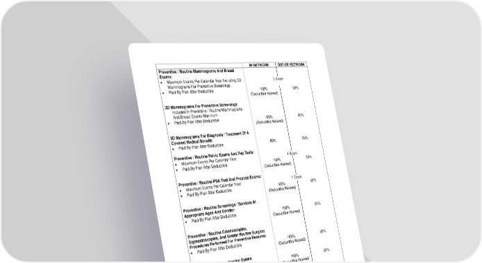 IN-NETWORK OUT-OF-NETWORK Preventive / Routine Mammograms And Breast Exams: • Maximum Exams Per Calendar Year Including 3D 1 Exam Mammograms For Preventive Screenings • Paid By Plan After Deductible 100% 60% (Deductible Waived) 3D Mammograms For Preventive Screenings: Included In Preventive / Routine Mammograms And Breast Exams Maximum • Paid By Plan After Deductible 100% 60% (Deductible Waived) 3D Mammograms For Diagnosis / Treatment Of A Covered Medical Benefit: • Paid By Plan After Deductible 80% 60% Preventive / Routine Pelvic Exams And Pap Tests: • Maximum Exams Per Calendar Year 1 Exam • Paid By Plan After Deductible 100% 60% (Deductible Waived) Preventive / Routine PSA Test And Prostate Exams: • Maximum Exams Per Calendar Year 1 Exam • Paid By Plan After Deductible 100% 60% (Deductible Waived) Preventive / Routine Screenings / Services At Appropriate Ages And Gender: • Paid By Plan After Deductible 100% 60% (Deductible Waived) Preventive / Routine Colonoscopies, Sigmoidoscopies, And Similar Routine Surgical Procedures Performed For Preventive Reasons: • Paid By Plan After Deductible 100% 60% (Deductible Waived) Preventive / Routine Hearing Exams: • Paid By Plan After Deductible 100% 60% (Deductible Waived) Preventive / Routine Eye Exams And Glaucoma Testing: • Maximum Exams Per Calendar Year 1 Exam • Paid By Plan After Deductible 100% 60% (Deductible Waived) Preventive / Routine Counseling For Alcohol Or Substance Use Disorder, Tobacco / Nicotine Use, Obesity, Diet, And Nutrition: • Paid By Plan After Deductible 100% 60% (Deductible Waived) -26- 7670-00-413597