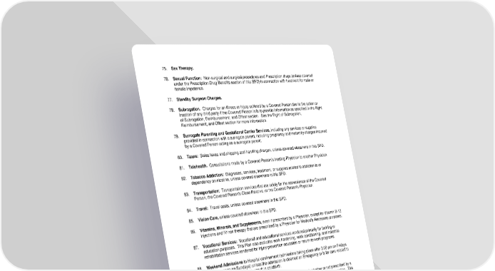 75. Sex Therapy. 76. Sexual Function: Non-surgical and surgical procedures and Prescription drugs (unless covered under the Prescription Drug Benefits section of this SPD) in connection with treatment for male or female impotence. 77. Standby Surgeon Charges. 78. Subrogation. Charges for an Illness or Injury suffered by a Covered Person due to the action or inaction of any third party if the Covered Person fails to provide information as specified in the Right of Subrogation, Reimbursement, and Offset section. See the Right of Subrogation, Reimbursement, and Offset section for more information. 79. Surrogate Parenting and Gestational Carrier Services, including any services or supplies provided in connection with a surrogate parent, including pregnancy and maternity charges Incurred by a Covered Person acting as a surrogate parent. 80. Taxes: Sales taxes and shipping and handling charges, unless covered elsewhere in this SPD. 81. Telehealth. Consultations made by a Covered Person’s treating Physician to another Physician. 82. Tobacco Addiction: Diagnoses, services, treatment, or supplies related to addiction to or dependency on nicotine, unless covered elsewhere in this SPD. 83. Transportation: Transportation services that are solely for the convenience of the Covered Person, the Covered Person's Close Relative, or the Covered Person's Physician. 84. Travel: Travel costs, unless covered elsewhere in this SPD. 85. Vision Care, unless covered elsewhere in this SPD. 86. Vitamins, Minerals, and Supplements, even if prescribed by a Physician, except for Vitamin B-12 injections and IV iron therapy that are prescribed by a Physician for Medically Necessary purposes. 87. Vocational Services: Vocational and educational services rendered primarily for training or education purposes. This Plan also excludes work hardening, work conditioning, and industrial rehabilitation services rendered for Injury prevention education or return-to-work programs. 88. Weekend Admissions to Hospital confinement (admissions taking place after 3:00 pm on Fridays or before noon on Sundays) unless the admission is deemed an Emergency or is for care related to pregnancy that is expected to result in childbirth. 89. Weight Control: Treatment, services, or surgery for weight control, whether or not prescribed by a Physician or associated with an Illness, except as specifically stated for preventive counseling. This exclusion does not apply to specific services for Morbid Obesity as listed in the Covered Medical Benefits section of this SPD. 90. Wigs (Cranial Prostheses), Toupees, Hairpieces, Hair Implants or Transplants, or Hair Weaving, or any similar item for replacement of hair regardless of the cause of hair loss, unless covered elsewhere in this SPD. -95- 7670-00-413597