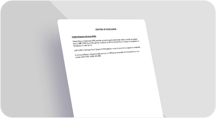 CENTERS OF EXCELLENCE Kidney Resource Services (KRS) Kidney Resource Services (KRS) provides access to a preferred provider dialysis network and support from a UMR CARE Nurse Manager by collaborating with the Covered Person to delay the progression of the disease to renal failure. UMR CARE End-Stage Renal Disease (ESRD) specialty nurses focus on clinical support and treatments. If a Covered Person chooses to seek services at a KRS preferred provider, the Covered Person must contact UMR CARE at 866-494-4502. -83- 7670-00-413597
